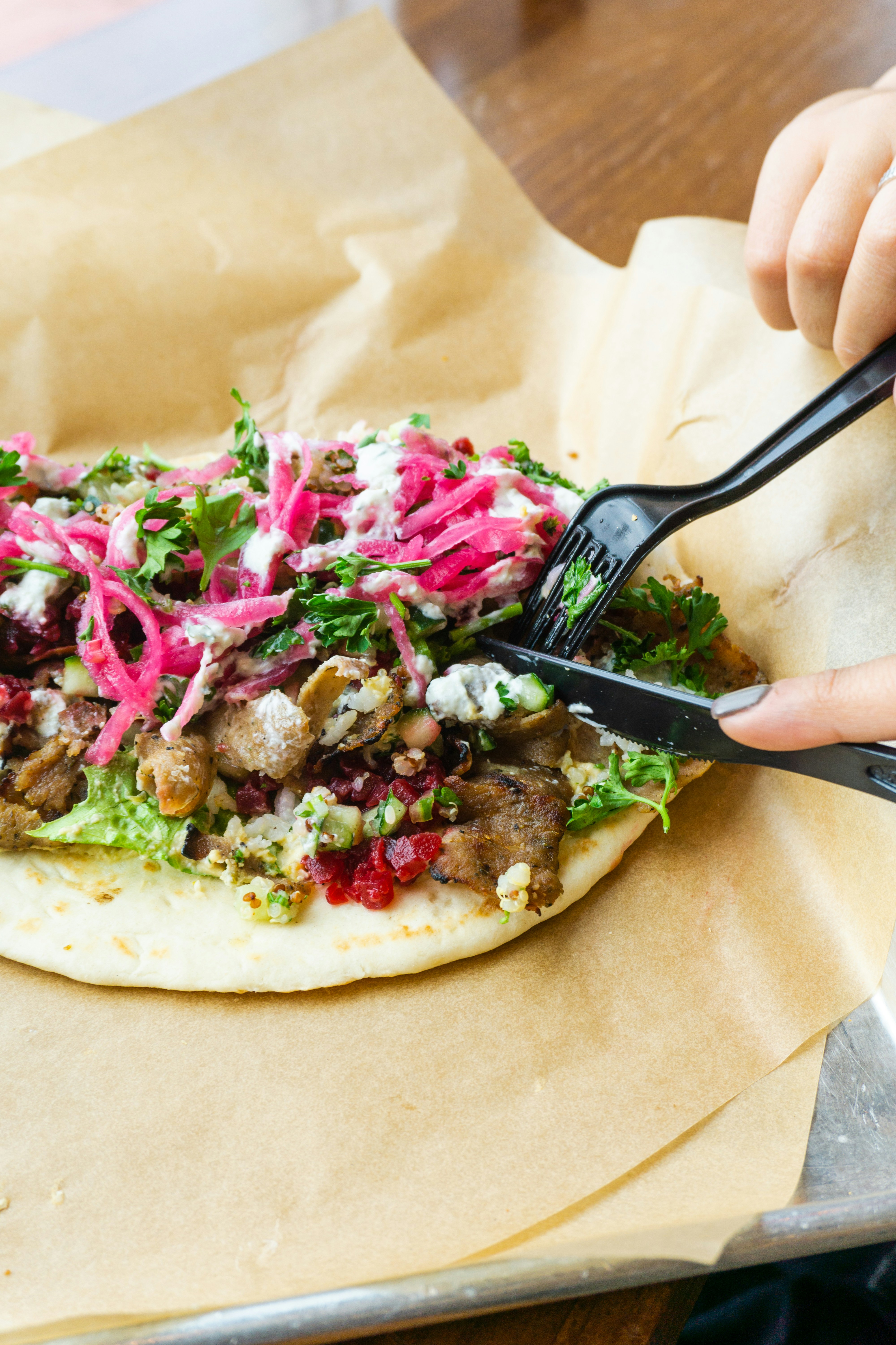 Warm large flatbreads or pita, spreading a thin layer of hummus as initial moisture barrier.